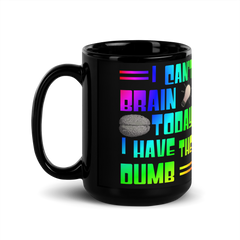This eye-catching ceramic mug features the phrase "I Can't Brain Today, I Have the Dumb" in a bold, colorful rainbow text that pops against the glossy black background. The whimsical design pokes lighthearted fun at those inevitable days when our brains just don't seem to function at full capacity.