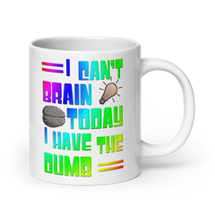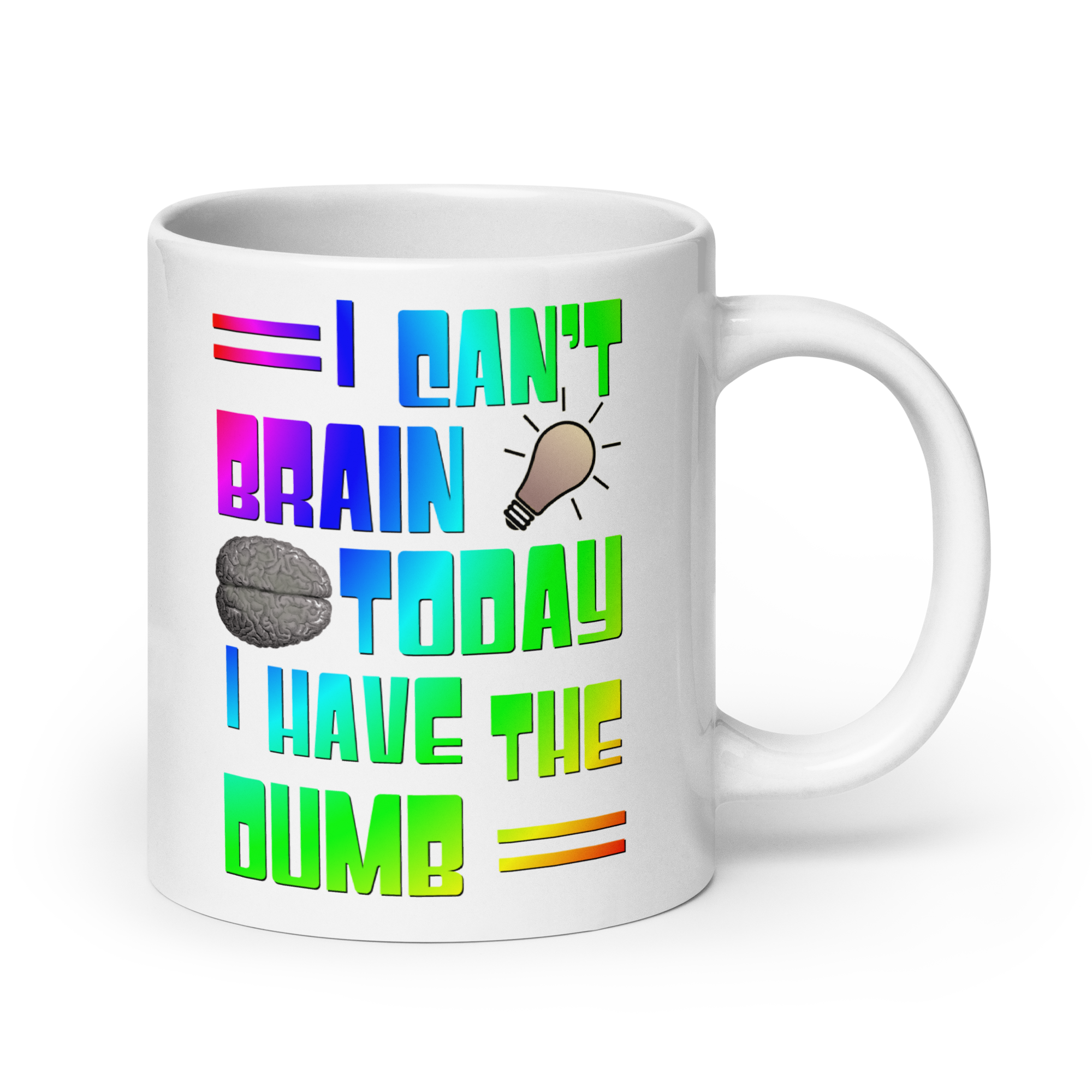 This cheerful ceramic mug features the phrase "I Can't Brain Today, I Have the Dumb" in a bold, colorful rainbow text that stands out beautifully against the glossy white background. The lighthearted design pokes fun at those days when our brains just don't seem to be functioning at their best, serving as a relatable reminder to take things in stride.