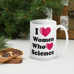 This elegant white ceramic mug features the powerful phrase "I ❤️ Women Who Love Science," with a vibrant red heart symbolizing your admiration and support for women who are breaking barriers and shaping the future of science.