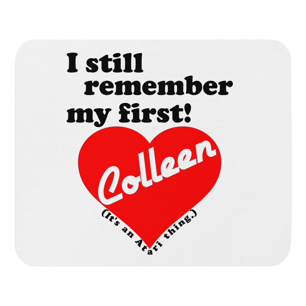 Featuring a striking design, this white mouse pad showcases a large red heart with the word "Colleen" elegantly displayed in white diagonally across it, paying homage to the beloved codename of the revolutionary Atari 800. The captivating graphic is accompanied by the phrases "I still remember my first" and "It's an Atari thing," artfully arranged above and below the heart, respectively.