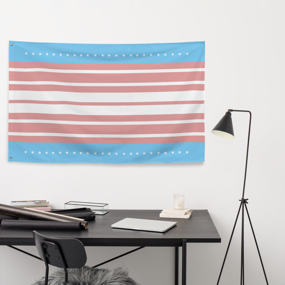This is not my original design. I'm currently in the process of trying to find the original artist, Until I do, a portion of the profits will be donated to a Transgender Rights organization in the unknown artists name. I modified the design somewhat to better fit the actual dimensions of a flag. Note that I've also broadened the intermediary stripes. They were quite thin to help the baby blue/pink/white/pink/baby blue effect. However, in the US flag, they're supposed to be at equal, to show that none of the founding states were better than another, so I enlarged them slightly. The transgender color bands should still be obvious.