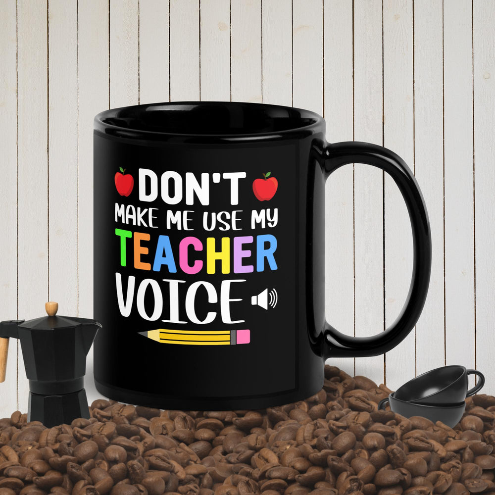 This sleek black ceramic mug features bold colorful text: βDonβt make me use my teacher voice.β Durable and microwave/dishwasher-safe, itβs ideal for teachers, parents, or leaders seeking a humorous way to set boundaries. The message preemptively discourages misbehavior, reducing stress by avoiding confrontations. Its relatable humor sparks camaraderie, validating the challenges of authority roles while fostering smiles over frustration. With an easy-grip handle and everyday utility, itβs a functional, uplifting tool for coffee or teaβand a gift that empowers with wit. Perfect for anyone who balances firmness with heart, blending practicality with a punch of personality.Β Β