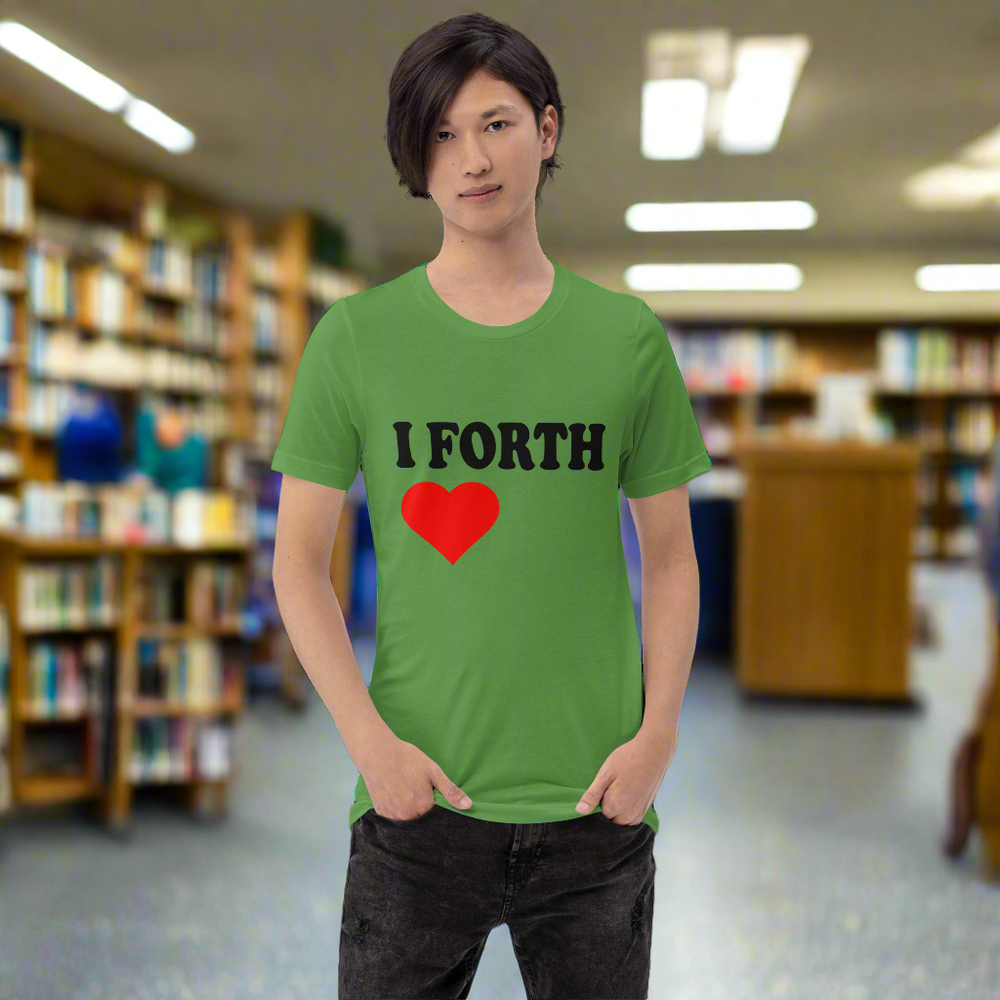 The design features the playful phrase "I FORTH Love" with a vibrant red heart graphic replacing the word "love," symbolizing your deep appreciation for Forth. The use of "Forth" as a homophone for "fourth" cleverly connects to the language's name and adds a touch of wit that is sure to delight fellow Forth aficionados.