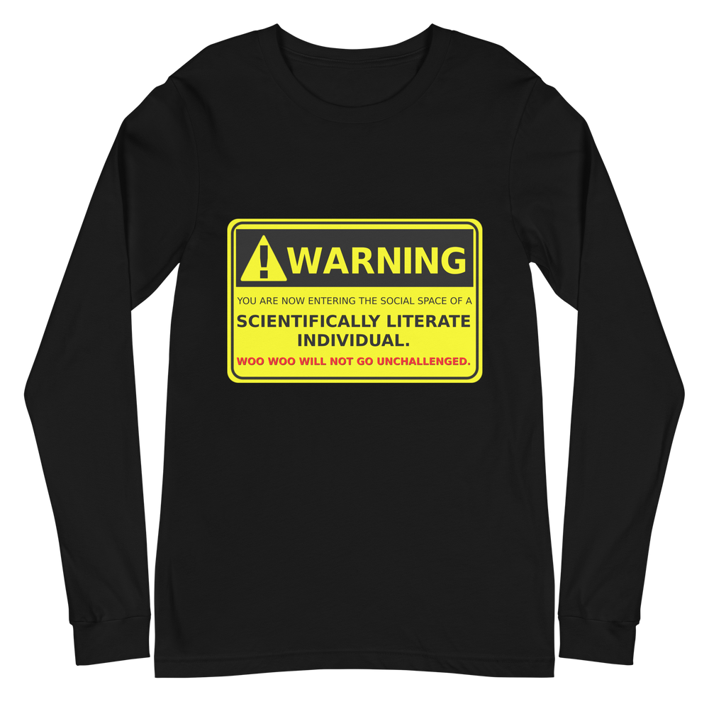 This long sleeve tee features the statement "Warning: You are now entering the social space of a scientifically literate individual. Woo woo will not go unchallenged," making it clear that pseudoscience and unfounded claims won't fly in your presence.