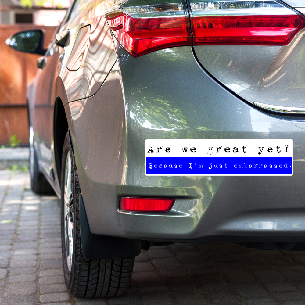 Embrace your right to express your perspective with our thought-provoking "Are We Great Yet?" bumper sticker. It's time to reflect on our collective progress and ask ourselves: are we truly great yet, or is there more we need to do to make America the nation we know it can be?