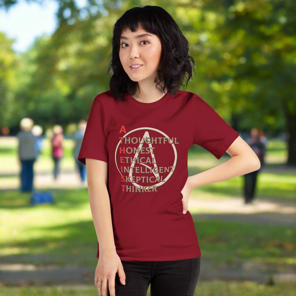 The atheist symbol is accompanied by a series of words that capture the essence of an inquisitive mind: "A Thoughtful Honest Ethical Intelligent Skeptical Thinker." Each word is prominently displayed on its own line, highlighting the core values that guide your journey of questioning and understanding the world around you.