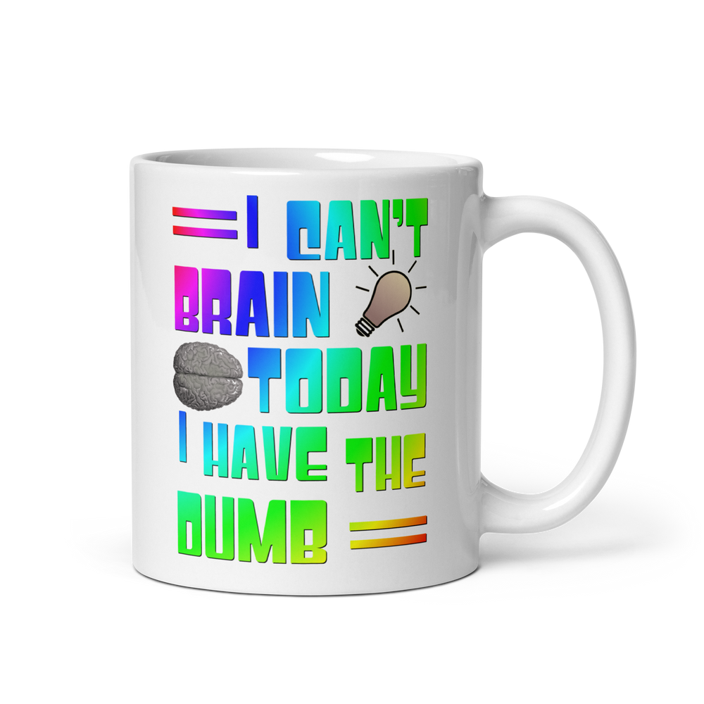 This cheerful ceramic mug features the phrase "I Can't Brain Today, I Have the Dumb" in a bold, colorful rainbow text that stands out beautifully against the glossy white background. The lighthearted design pokes fun at those days when our brains just don't seem to be functioning at their best, serving as a relatable reminder to take things in stride.