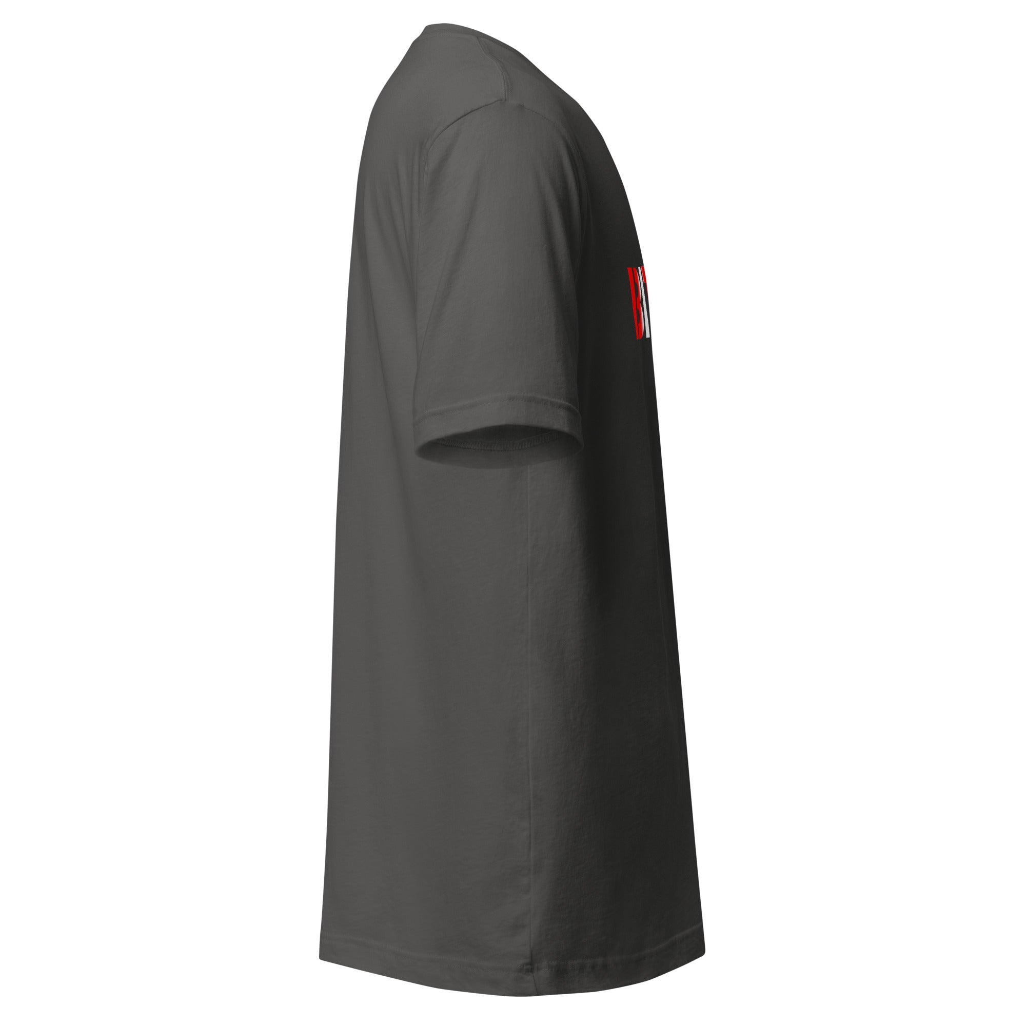 Features a high-impact, industrial stencil-style typeface with a striking red-to-white gradient. This bold, urban streetwear design is perfect for those who want to make a statement with sharp lines and high-contrast visuals on a dark background.