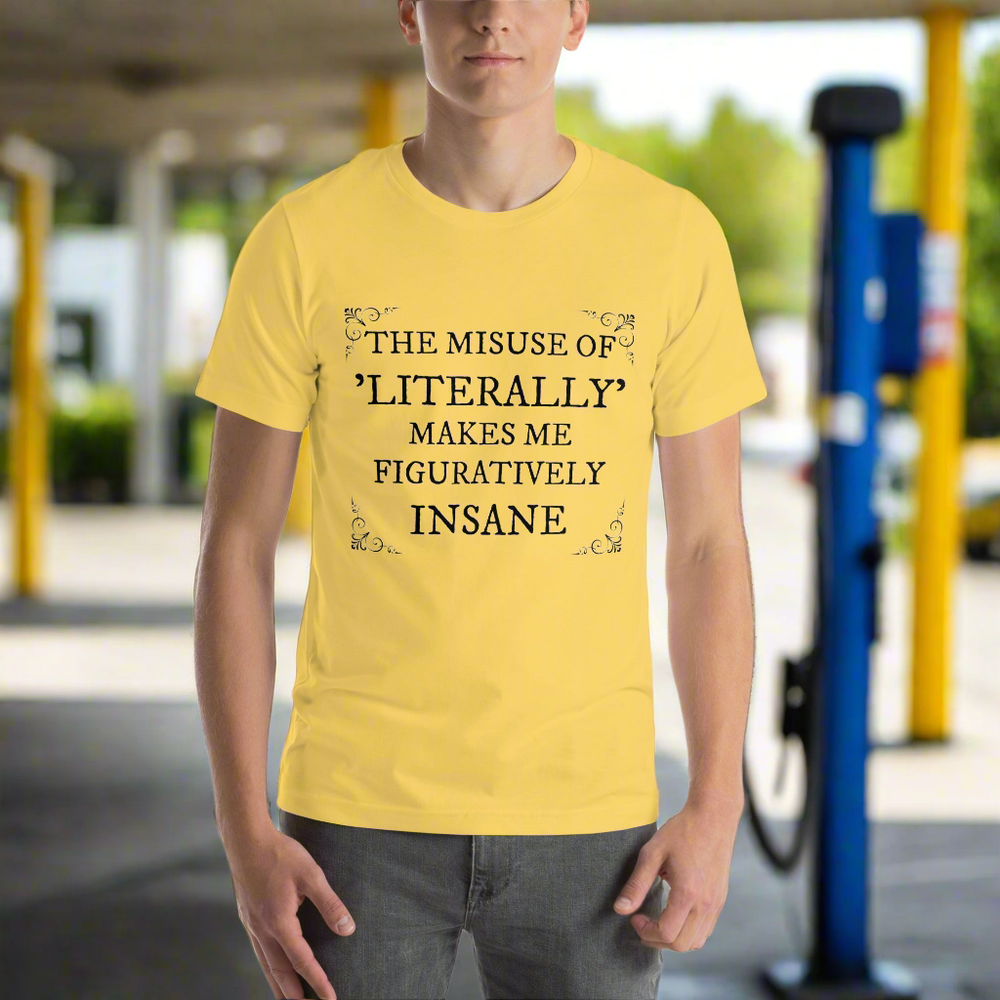 Are you someone who loves proper grammar and can't stand the misuse of the word "literally"? Then our "The misuse of literally makes me figuratively insane" short sleeve t-shirt is the perfect addition to your wardrobe! 📖